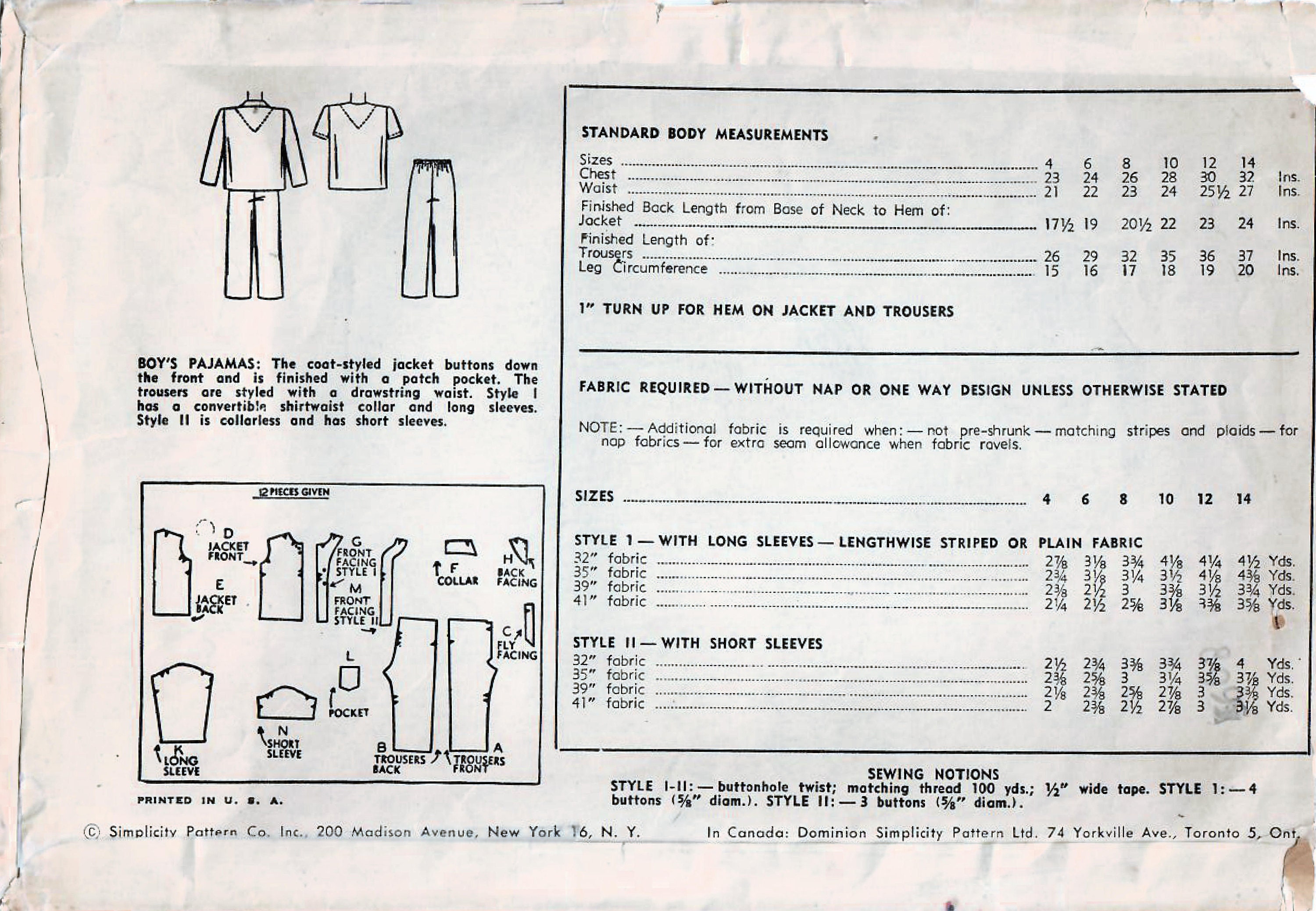 Simplicity 2541 Boys Pajamas 40s Vintage Sewing Pattern Etsy